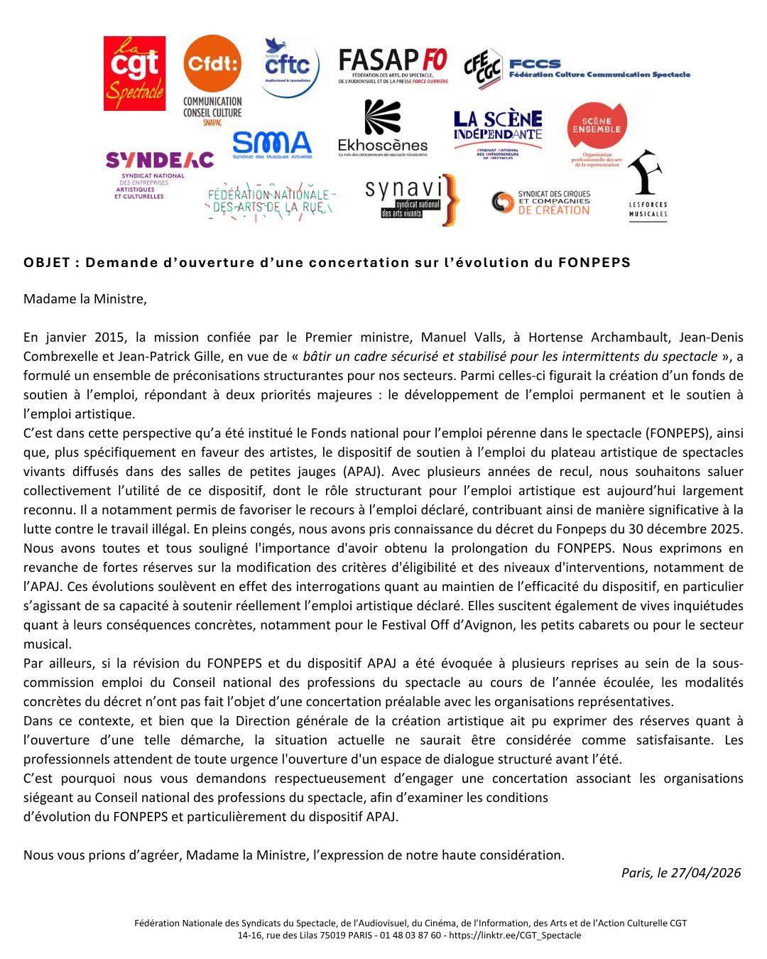 Lundi 27 avril 2026, les professionnels de l’intersyndicale du spectacle vivant public ont demandé l’engagement d’une concertation associant les organisations siégeant au Conseil National des Professions du Spectacle dans un courrier adressé à la nouvelle ministre de la Culture, Catherine Pégard.